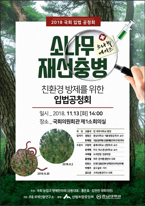 [더뉴스=김기혁 기자] 자유한국당 홍문표 국회의원(자유한국당, 충남 예산․홍성)국회의원이 공동대표로 있는 ‘국회 농업과 행복한 미래’가 주최하고 국제선충연구소가 주관하며, 산림조합중앙회, 충남대학교가 후원하는 ‘소나무 재선충병 친환경 방제’를 위한 입법 공청회가 11월 13일 화요일 오후 2시, 국회 의원회관 제1소회의실에서 개최될 예정이다.